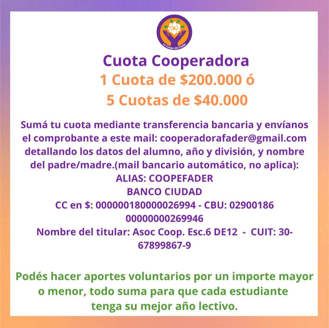 Para poder asentar correctamente el pago, luego de hacer el depósito o transferencia, enviar por mail ([email protected]) el comprobante con los datos del alumno, año y división, y nombre del padre/madre.
